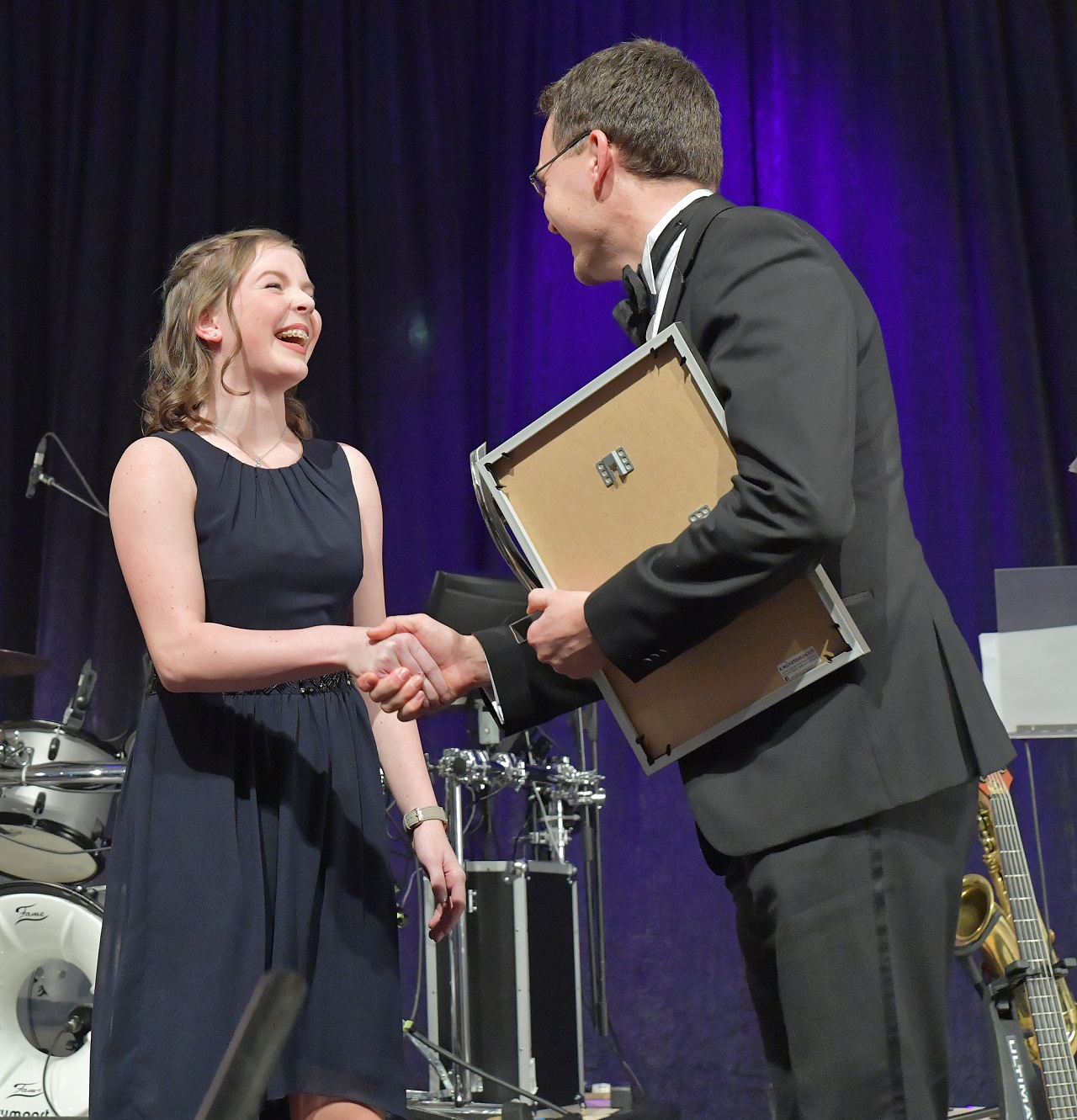 Der Verleger (GN) Joachen Anderweit überreicht der völlig überraschten Stina die Urkunde und den Pokal, die es augenscheinlich kaum fassen kann, gewonnen zu haben!