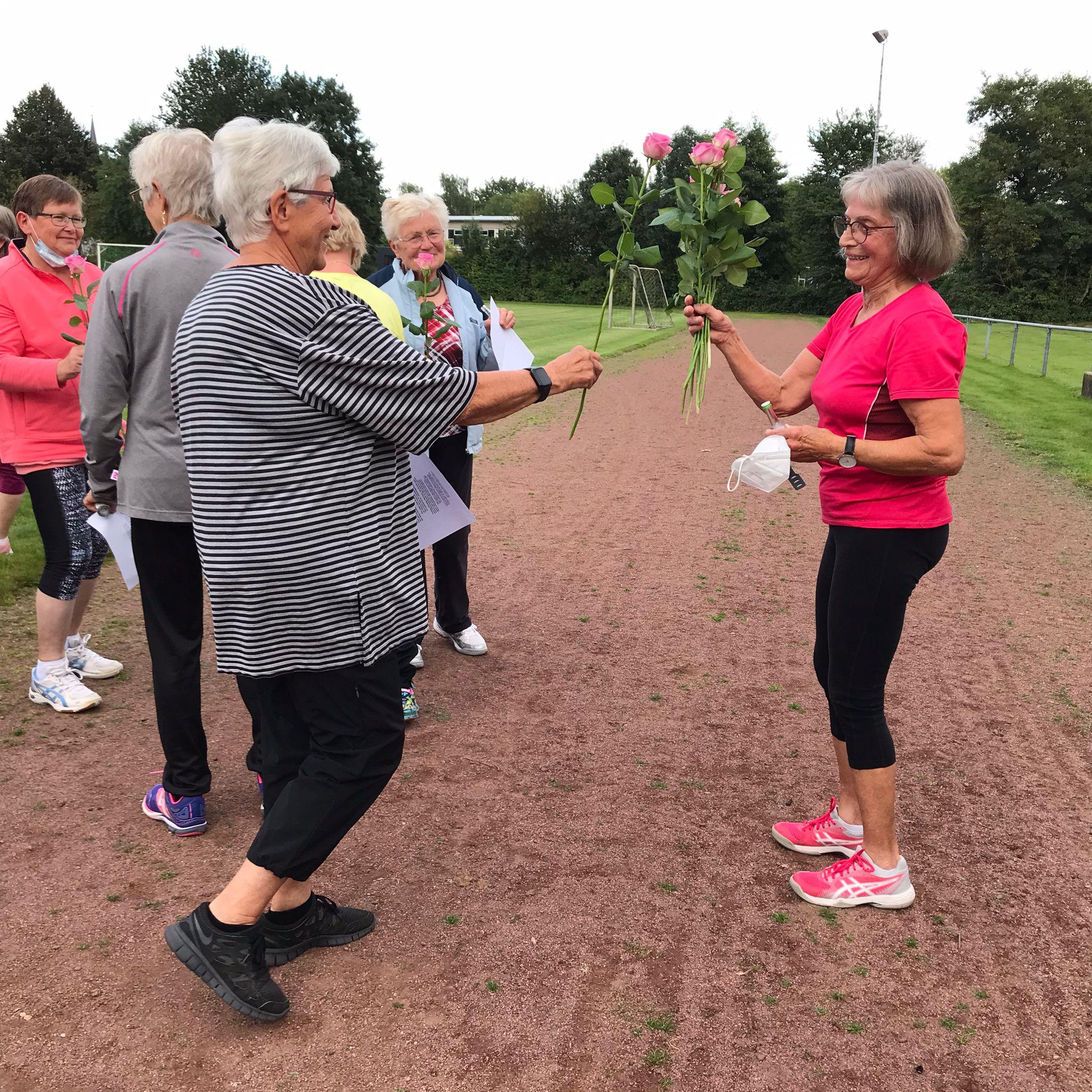 Am 06. September 2021 – nach den Sommerferien – war die Gruppe 65+ sehr stark vertreten. Es gab eine Riesen- Überraschung für Gerhilde. Die Gruppe gratulierte Gerhilde zum 80. Geburtstag mit einem Geburtstagsständchen, jede Teilnehmerin schenkte eine Rose, so dass sich am Ende ein dicker Strauß von etwa 30 Blüten entwickelte. Zwei Uelsen-Gutscheine aus der Freud- und Leidkasse, Pralinen und eine Flasche Seco rundeten die Präsente ab.