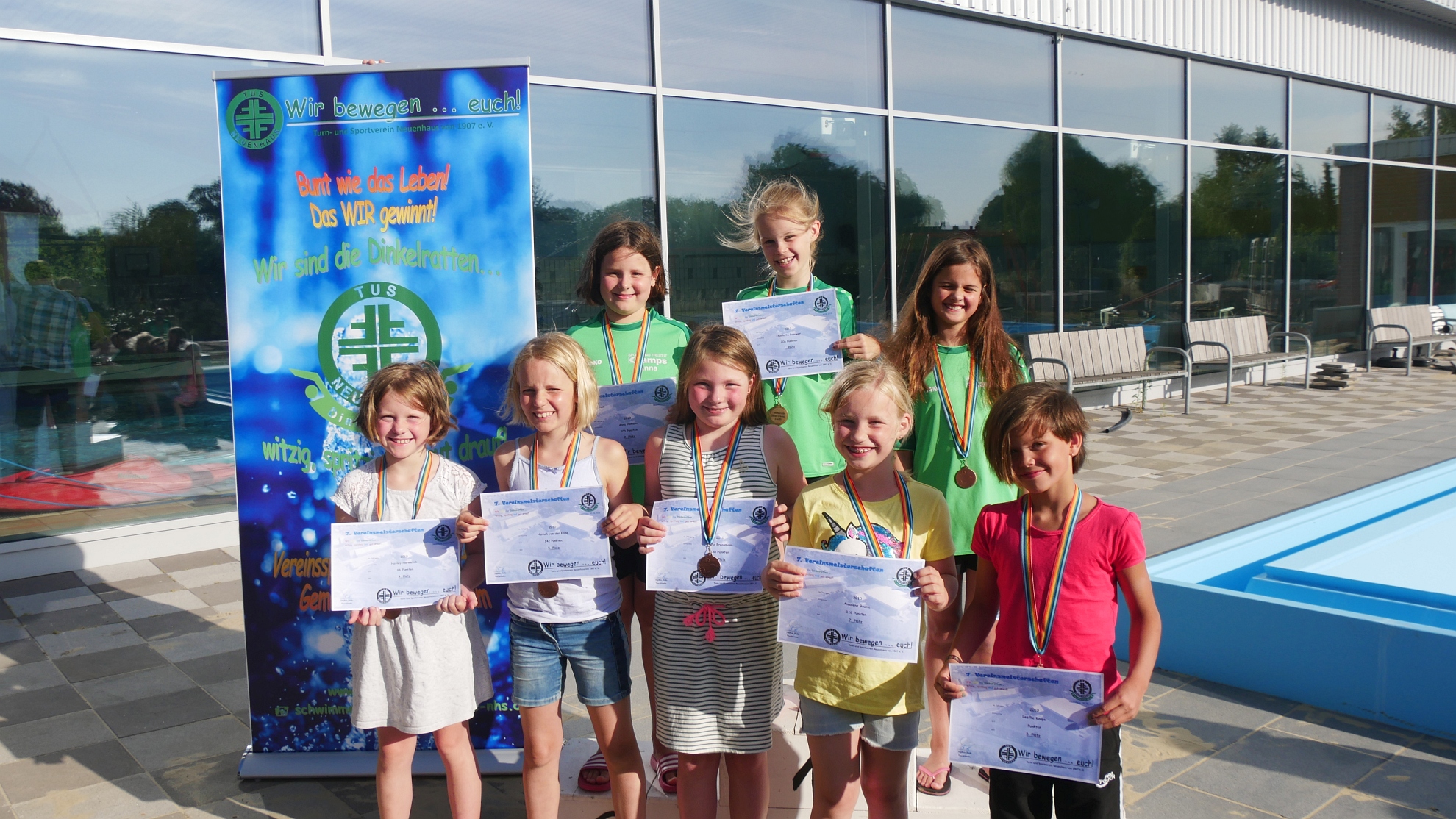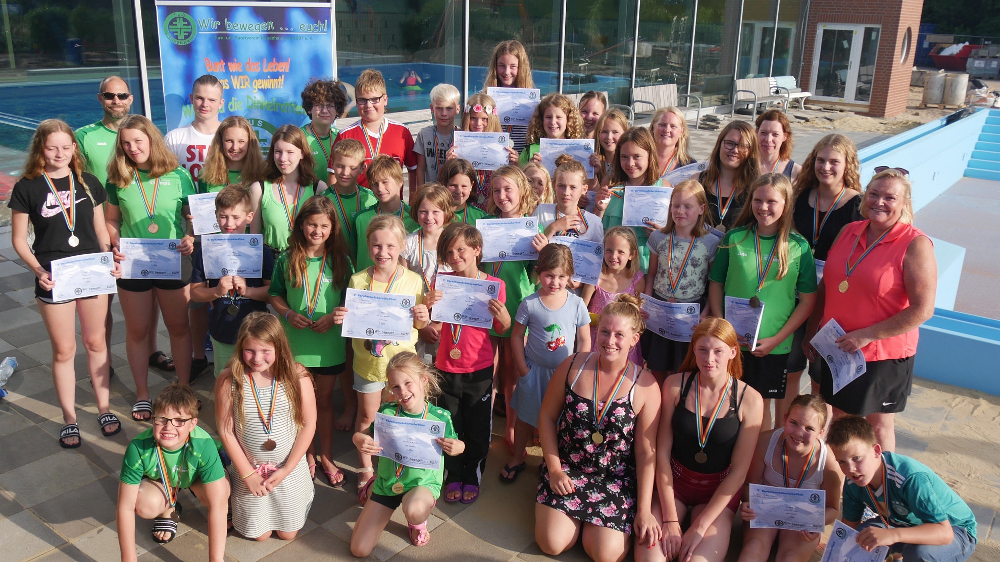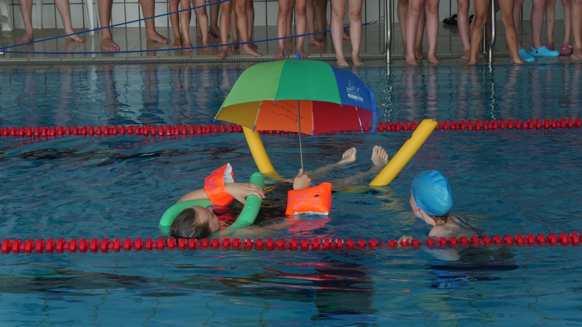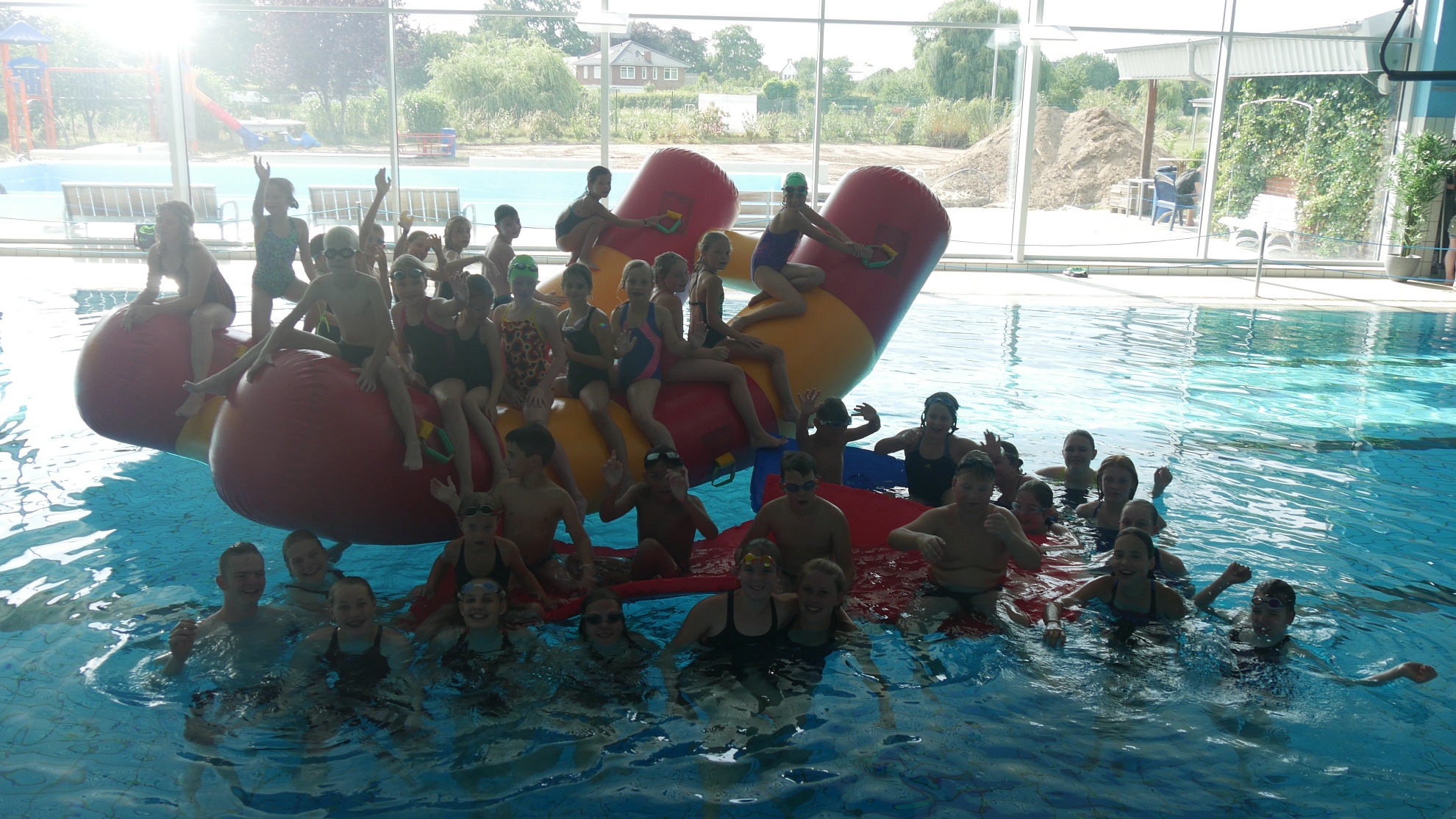 Am letzten Sonntag vor den Sommerferien war es wieder soweit, die Vereinsmeisterschaften mit kleinem Saisonabschluss standen an. Bei Kaffee und Kuchen, begleitet von bestem Wetter, konnten wir von 13 bis 18 Uhr im Dinkelbad unsere Bahnen ziehen, Juxstaffel schwimmen und ein Gummitier erobern. Mit viel Unterstützung der Eltern, die als Kuchenspender, Kampfrichter, Auswerter und helfende Hände überall mit angepackt haben, konnten wir eine erfolgreiche Veranstaltung über die Bühne bringen.