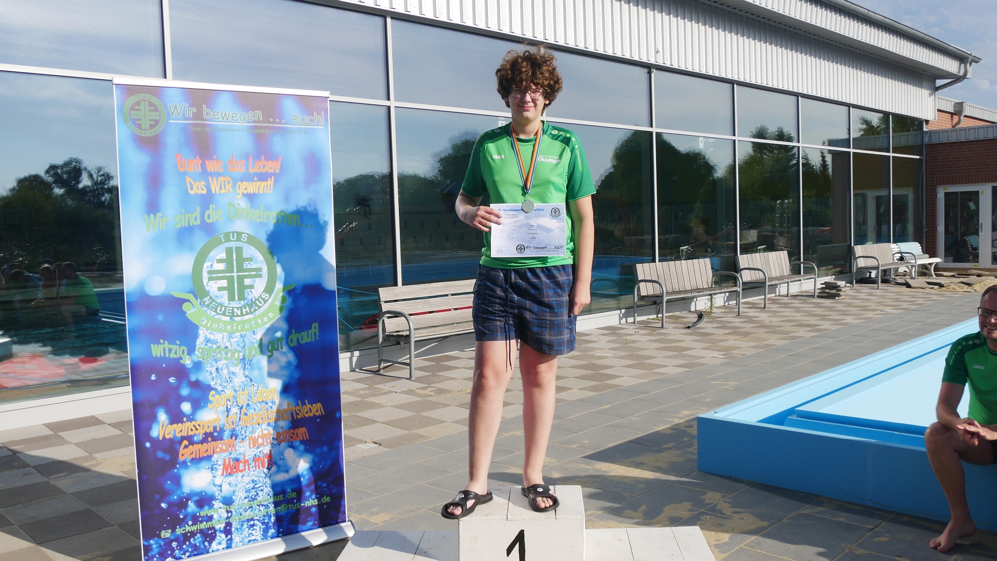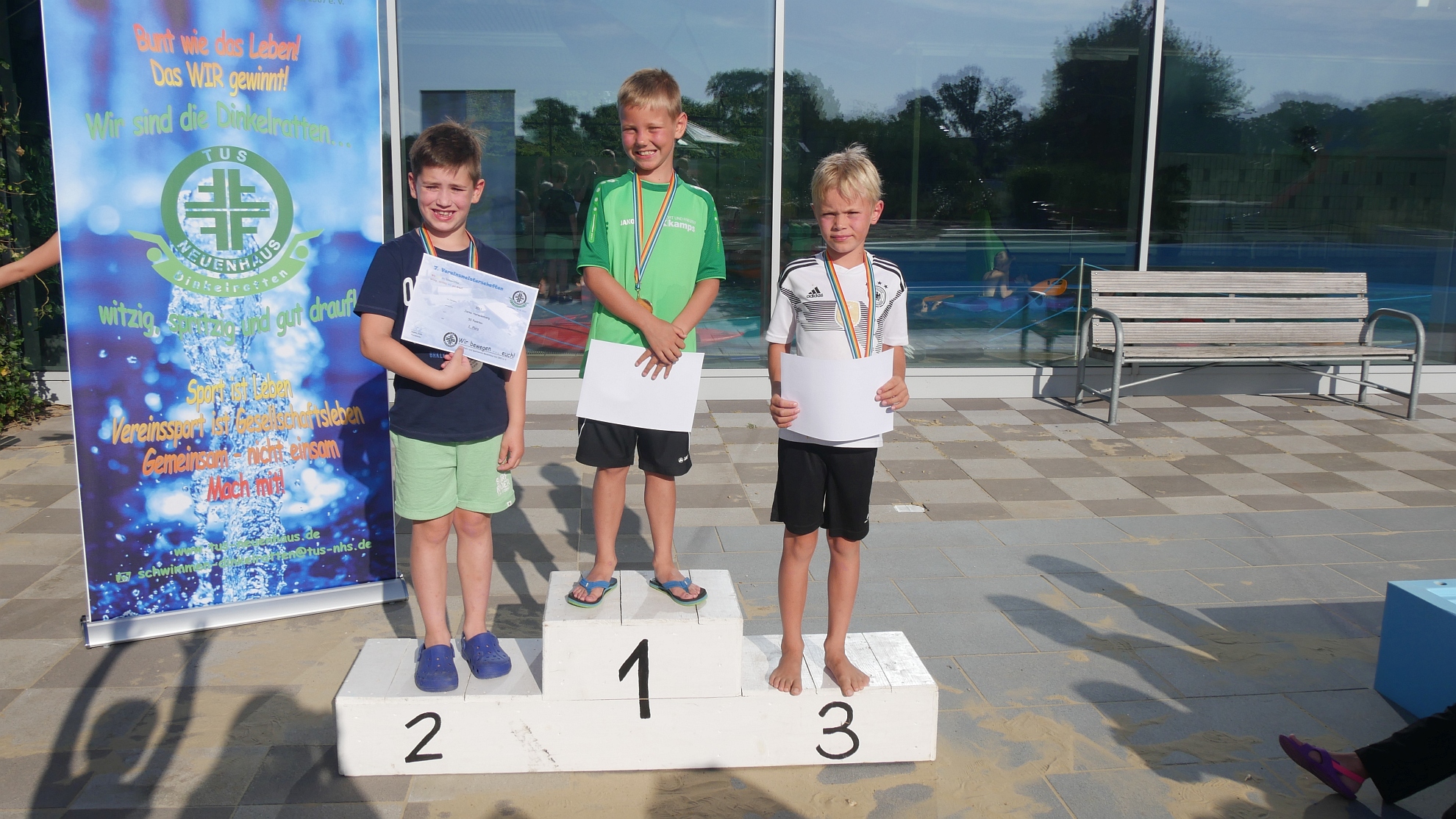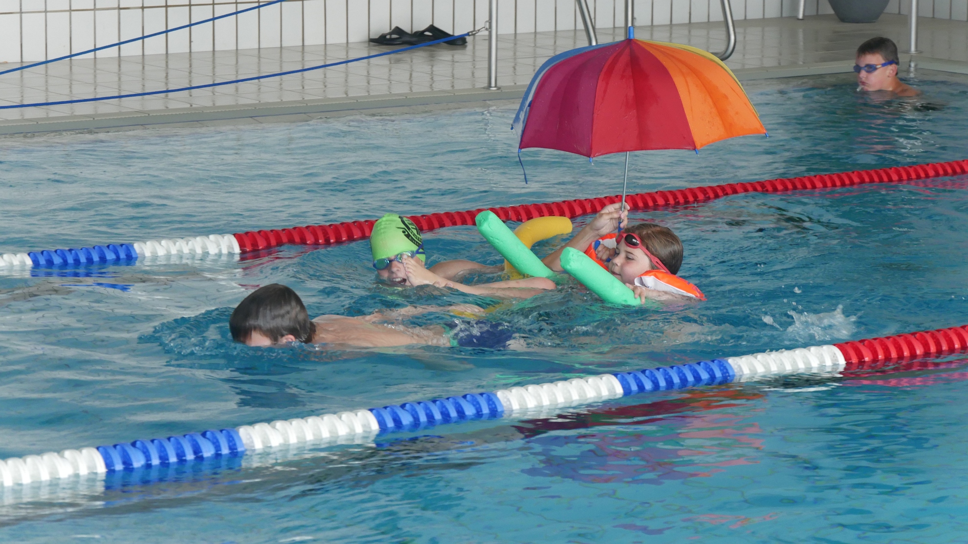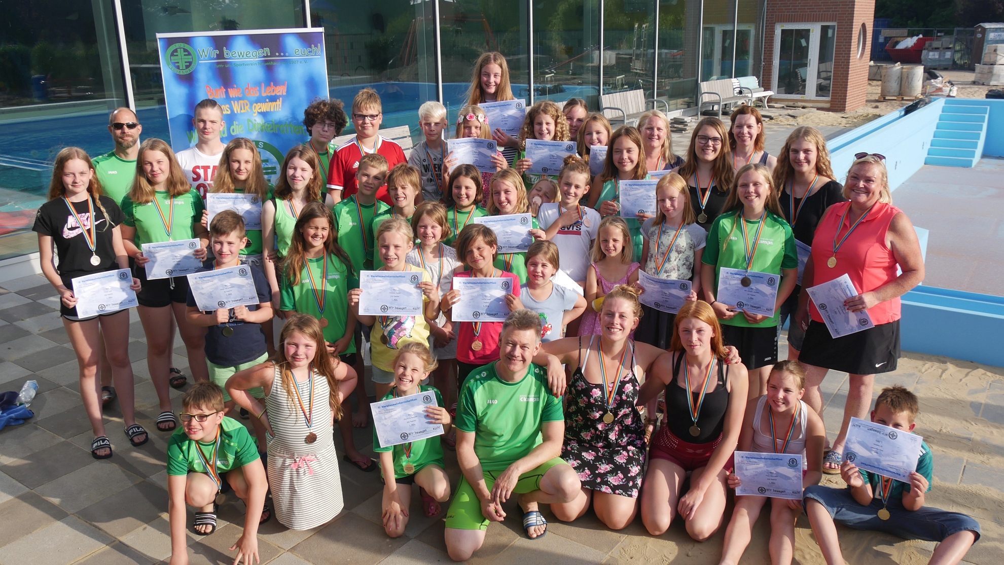 Am letzten Sonntag vor den Sommerferien war es wieder soweit, die Vereinsmeisterschaften mit kleinem Saisonabschluss standen an. Bei Kaffee und Kuchen, begleitet von bestem Wetter, konnten wir von 13 bis 18 Uhr im Dinkelbad unsere Bahnen ziehen, Juxstaffel schwimmen und ein Gummitier erobern. Mit viel Unterstützung der Eltern, die als Kuchenspender, Kampfrichter, Auswerter und helfende Hände überall mit angepackt haben, konnten wir eine erfolgreiche Veranstaltung über die Bühne bringen.