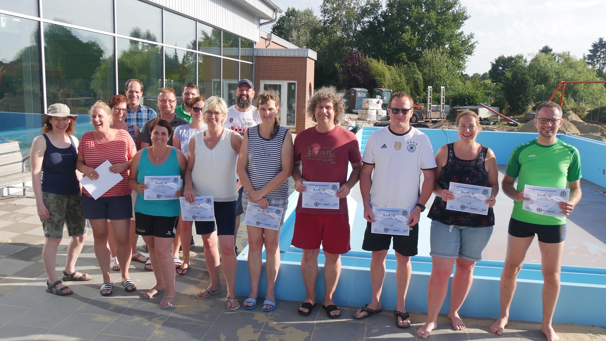 Vor dem neuen Außenbecken, das am 03. August eingeweiht wird, fand dann unsere Siegerehrung statt, bei der alle Kinder dabei waren, was sehr schön war! Wie jedes Jahr gab es neben den Urkunden Medaillen und keiner ist ohne nach Hause gegangen.