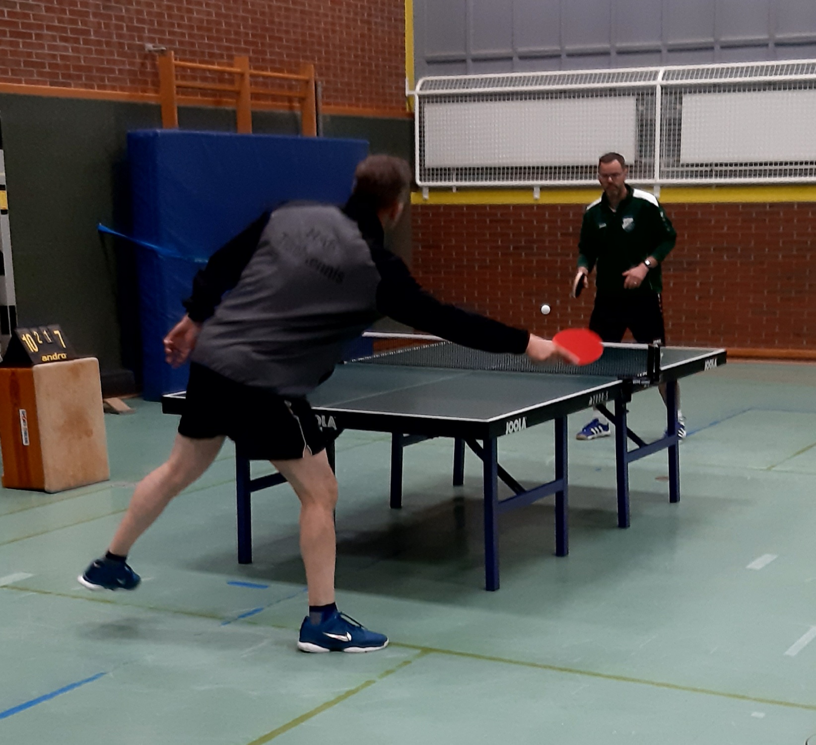 Erwähnenswert bei den Eingangsdoppeln vor allem das Spiel von Friedbert und Jens gegen die Nummern 1+2 des Gegners (Alberring/Steglich). Beide TuS-Akteure kamen mit dem Spiel von Alberring nicht zurecht und waren froh, dass Steglich noch weniger ins Spiel kam und die Fehlerquote bei ihm höher war, als auf TuS-Seite die Summe der Fehler. Nach 1-2-Satzrückstand und einem knappen 12-10 in Satz 4 lief es im Fünften dann etwas besser für uns und am Ende stand ein knappes 11-7. Die anderen beiden Doppel gingen relativ klar an uns. Hier hatten wir auch gehofft, dass Punkte bei den Duellen herauskommen, da wir nominell einfach leicht besser besetzt waren als der Gegner.