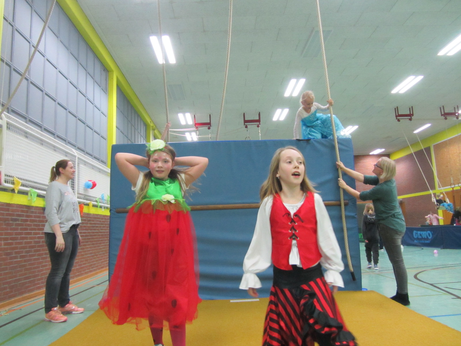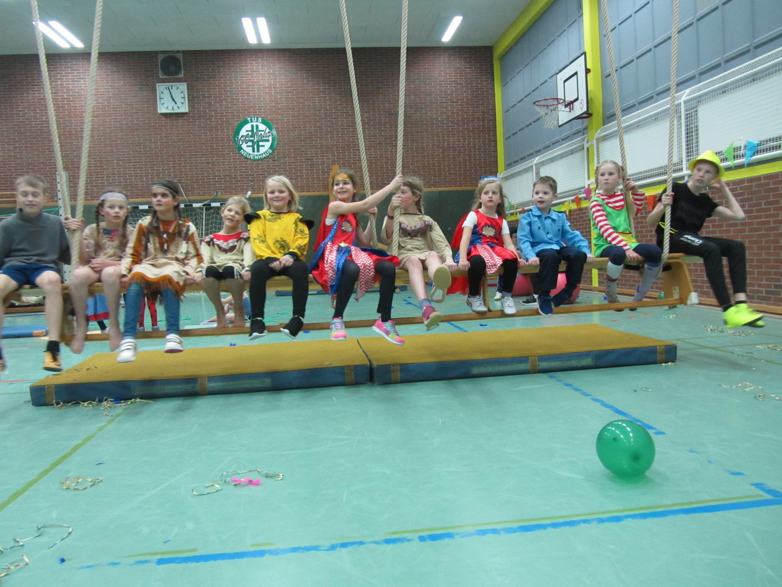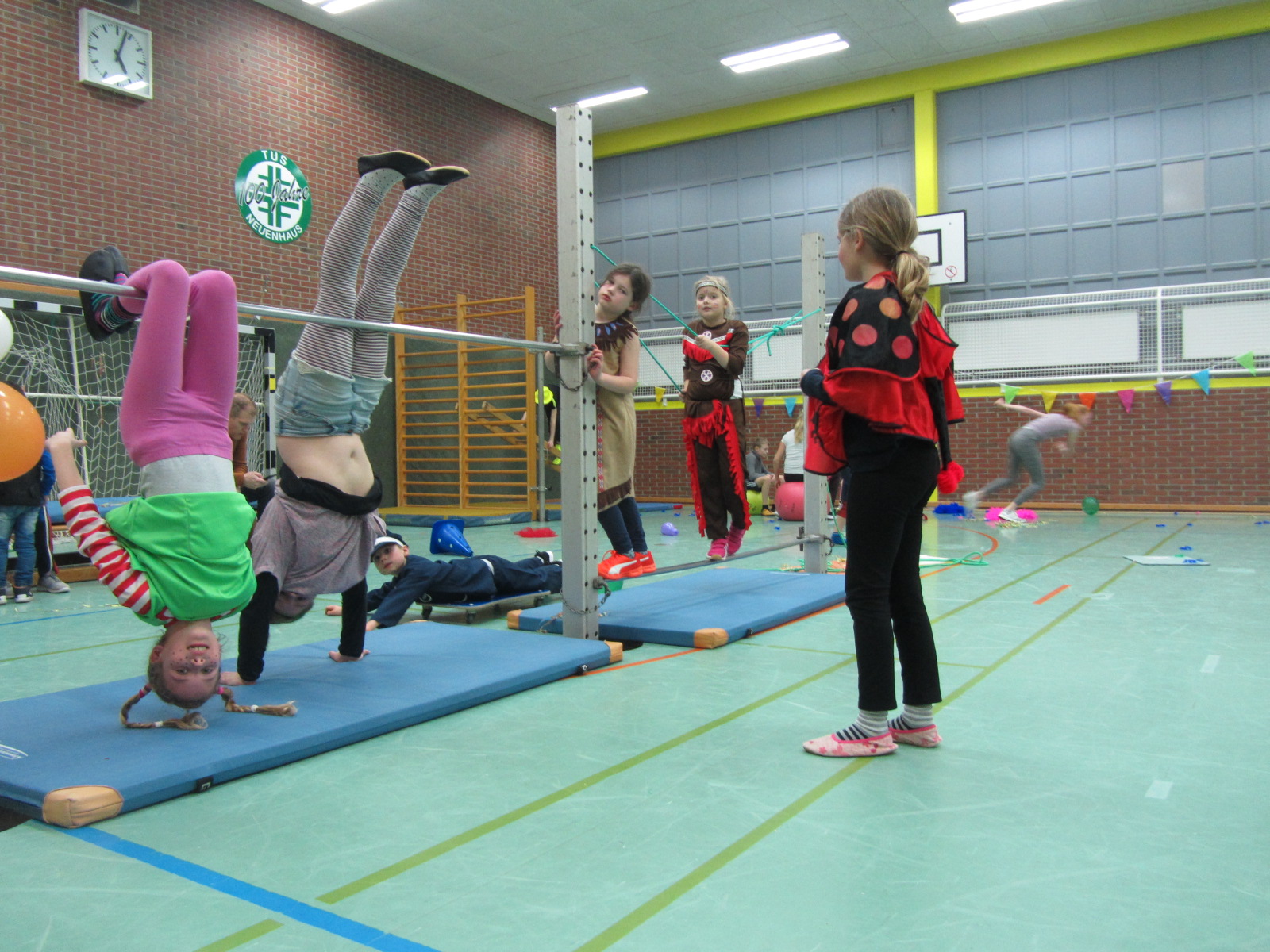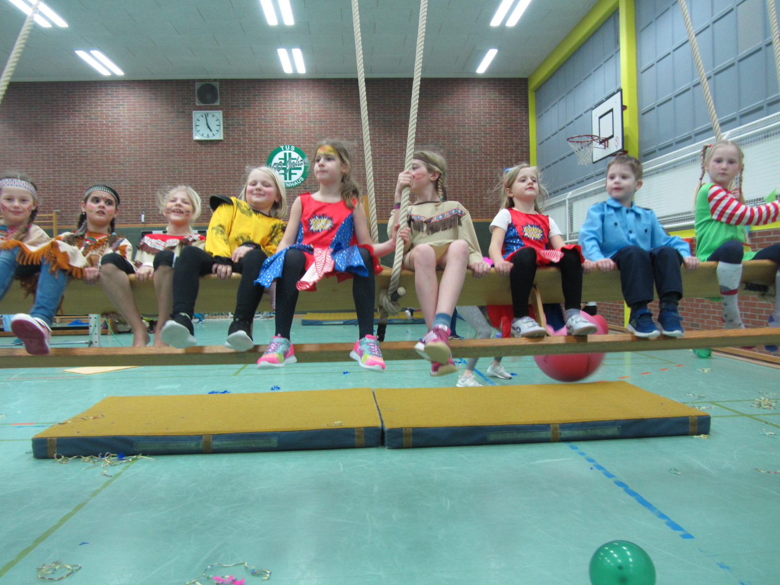 Mit ca. 150 Kindern fand an diesem Dienstag wieder das traditionelle Karnevalsturnen statt. Die Hermann-Lankhorst-Turnhalle war bunt geschmückt mit vielen verschiedenen Aufbauten. Die verkleideten Kinder waren mit Freude am Klettern, Spielen, Springen und Toben.